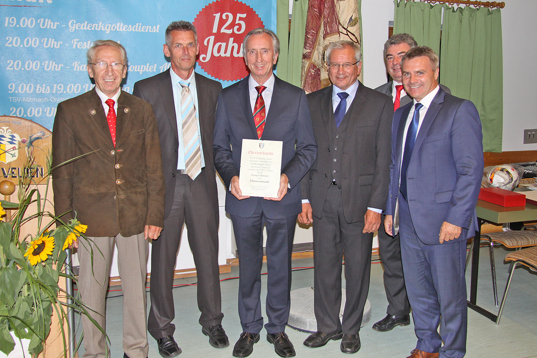 Mit einem gelungenen Festabend als Auftakt zur Jubiläumswoche zum 125-jährigen Bestehen stellte der TSV Velden eindrucksvoll seine gesellschaftliche Stellung im Gemeindeleben sowie seine Kompetenz im Breitensport unter Beweis. Dem Festabend ging ein Gottesdienst mit Pfarrer Tobias Rother zum Gedenken der verstorbenen Vereinsmitglieder voraus. Nach der Segnung eines Fahnenbandes richtet Festbraut Kristina Rostin ein Grußwort an die Gottesdienstbesucher und heftete das Fahnenband an die Vereinsfahne.