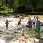 Vom Gasthaus „Am Zauberwald“ aus ging es durch den märchenhaften Wald immer am Wasser entlang bis zum Ufer der Hintersees, nach einer kleinen Abkühlung im kalten Nass bei ca. 16 Grad Wassertemperatur ging der Marsch weiter um den Hintersee herum. Auf Hälfte der Strecke wurde eine kleine Mittagspause gemacht und jeder konnte die Zeit frei verbringen. Egal ob eine Stärkung im Wirtshaus, eine Tretbootfahrt auf dem Hintersee, etwas dösen in der Sonne oder für ganz abgehärtete ein erfrischendes Bad im kalten See, jeder wusste die Pause gut zu nutzen. Frisch gestärkt und abgekühlt wurde die zweite Hälfte der Seeumrundung in Angriff genommen. Auf dem Rückweg durch den Wald blieb noch genügend Gelegenheit in den Gumpen und im Bachlauf zu planschen und die Füße zu erfrischen. Einen gemütlichen Abschluss fand die Wanderung dann im Gasthaus am Zauberwald, wo auf die Kinder auch noch ein kleiner Spielplatz wartete.