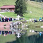 In diesem Jahr fand die Messfeier bei idealem Wanderwetter auf der Loferer Alm am Speichersee statt. Den meisten Mitgereisten sind die Loferer Steinberge nur im Winter von den Skikursen her bekannt, daher war es interessant alles einmal in saftigem Grün zu sehen. Mit vielen Autos und einem Kleinbus reisten die Veldener nach Lofer, wo es dann jedem freigestellt war entweder mit der Gondel oder zu Fuß ab der Mittelstation den See zu erreichen. Am See zelebrierte Pater Anton Dimpflmaier eine kurzweilige Messe in wunderbarer Kulisse umgeben von Bergen und dem See im Hinergrund. Besonders schön, war es in diesem Jahr wieder eine musikalische Begleitung dabei zu haben. Drei junge Burschen mit ihren Blasinstrumenten untermalten die Feier eindrucksvoll. Im Anschluss an die Messe verteilte sich die Gruppe und verbrachte die verbleibende Zeit mit einer gemütlichen Einkehr oder weiteren Wanderungen auf einem der zahlreichen Rundwege.