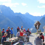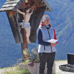 Während Kinder und Senioren den Sessellift zur Auffahrt nutzen, wanderte die Gruppe in einer Stunde zum Aussichtspunkt am Hochschwarzeck. Bei herrlichem Herbstwetter und strahlend blauem Himmel feierten 160 Veldener bei dem Marterl vor dem Berggasthaus Hirschkaser zusammen mit Pater Anton Dimpfelmeier einen Gottesdienst unter freiem Himmel. So war es den Gottesdienstbesuchern gegönnt bei musikalischer Umrahmung der Blechbläser „16 ½ Blech“ das außergewöhliche Panorama mit Hohem Göll, Watzmann, Hochkalter und der Reiter Alpe zu genießen. Bergfreunde-Spartenleiterin Evi Zehetbauer erinnerte an die verstorbenen Bergkameraden, insobesondere an Josef Kasseckert, der über viele Jahrzehnte die Bergfreunde bei Veranstaltungen und Bergtouren begleitete. Mit einem Abstecher zum nahegelegenen Gipfel des „Toten Mann“ und dem Abstieg ging die eindrucksvolles herbstliche Wanderung mit Bergmesse in den Berchtesgadener Bergen zu Ende.