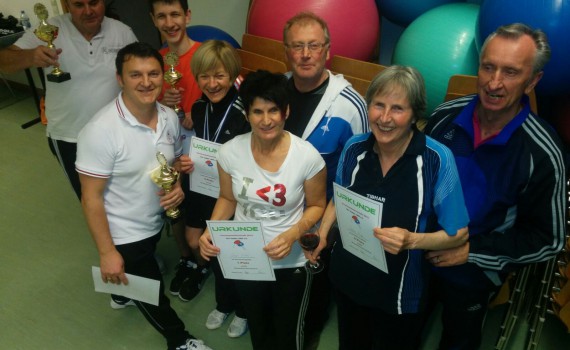 Nach dem Spiel ist gut lachen. Die Sieger des Turniers 2015. v.l. Anto Batkovic, Jürgen Wöhrl, Hans Köck, unser Jüngster Mik Kartmann, Richard Kopp, Maria Kopp, Sonja Liebl, Leonie Schlüter, Lukas Schlüter, Adrian Cristoi und der Namensgeber des Turniers Georg Lohmeier.